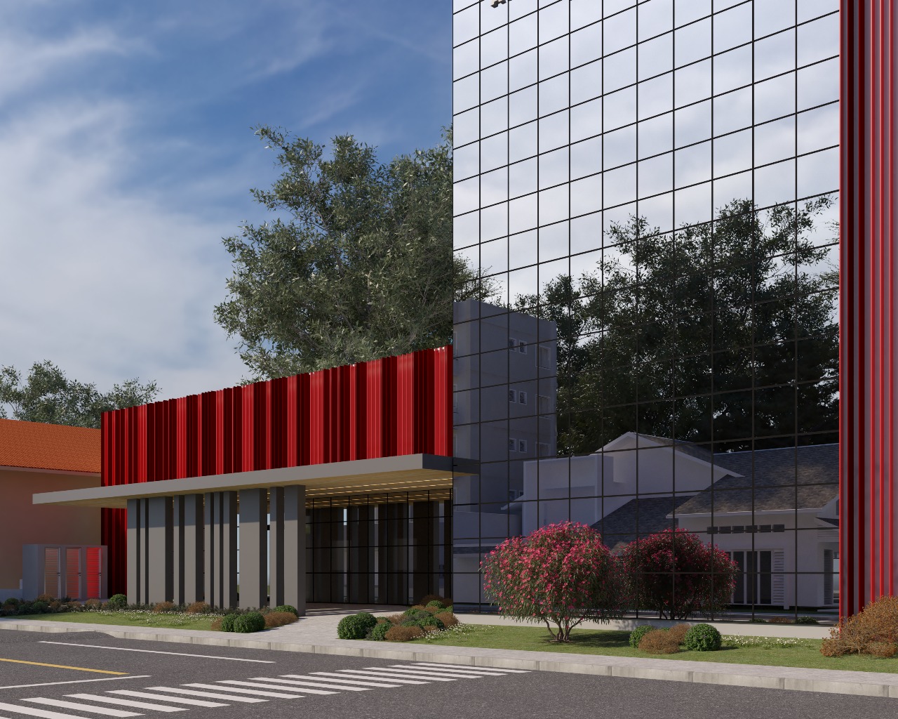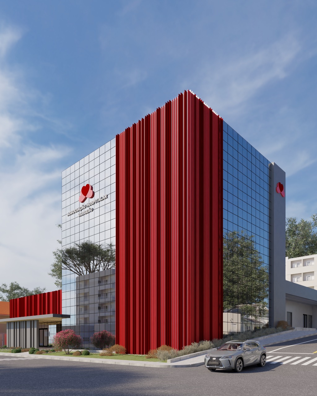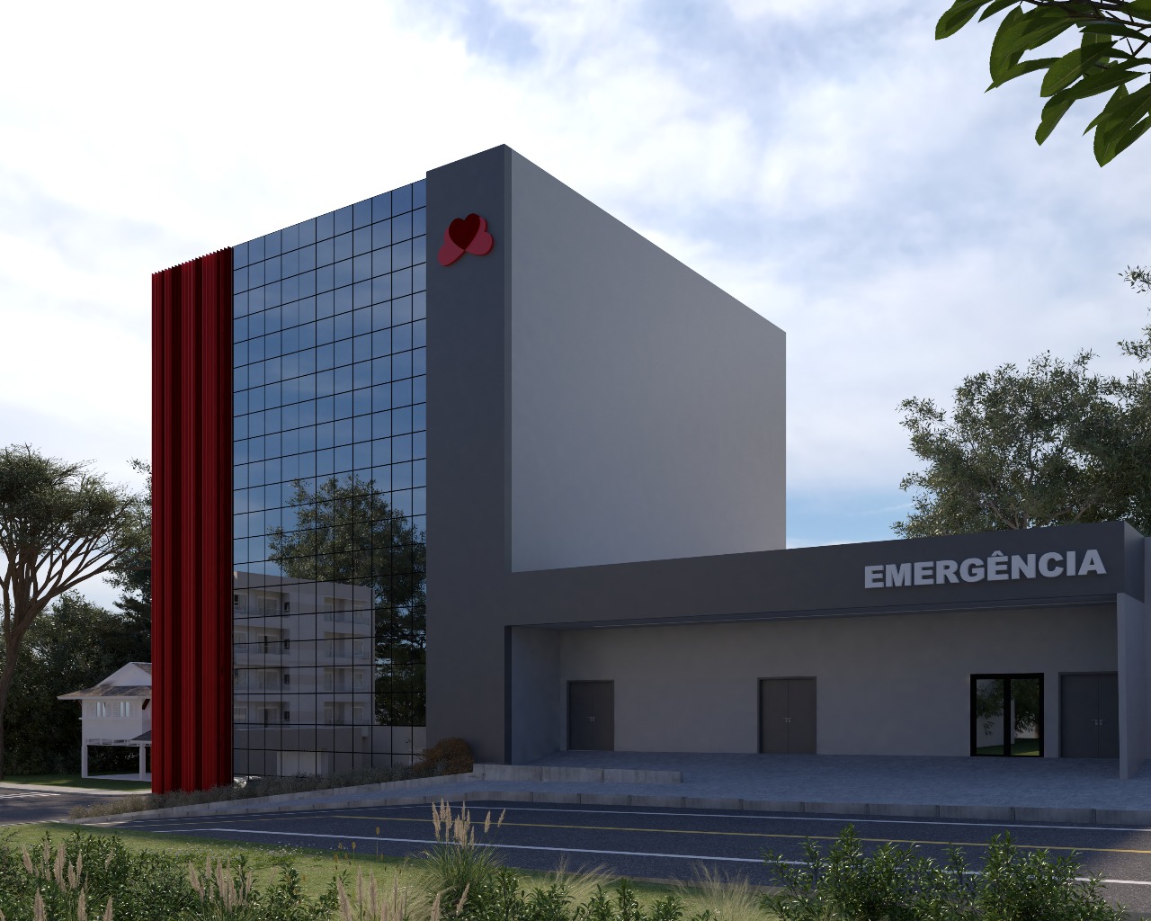 O desafio foi resolvido por meio da criação de uma torre compacta e verticalizada, capaz de abrigar todos os ambientes exigidos. A fachada foi concebida como um elemento de conexão entre o novo e o existente, utilizando brises metálicos nos núcleos institucionais do hospital. Essa solução não apenas reforça a identidade visual da instituição, como também promove uma unidade estética entre as edificações, revitalizando a construção atual sem intervenções estruturais invasivas. Os painéis de vidro complementam a composição, favorecendo a iluminação natural e a integração visual entre os espaços internos e externos, criando uma atmosfera mais acolhedora e humanizada para pacientes e colaboradores.